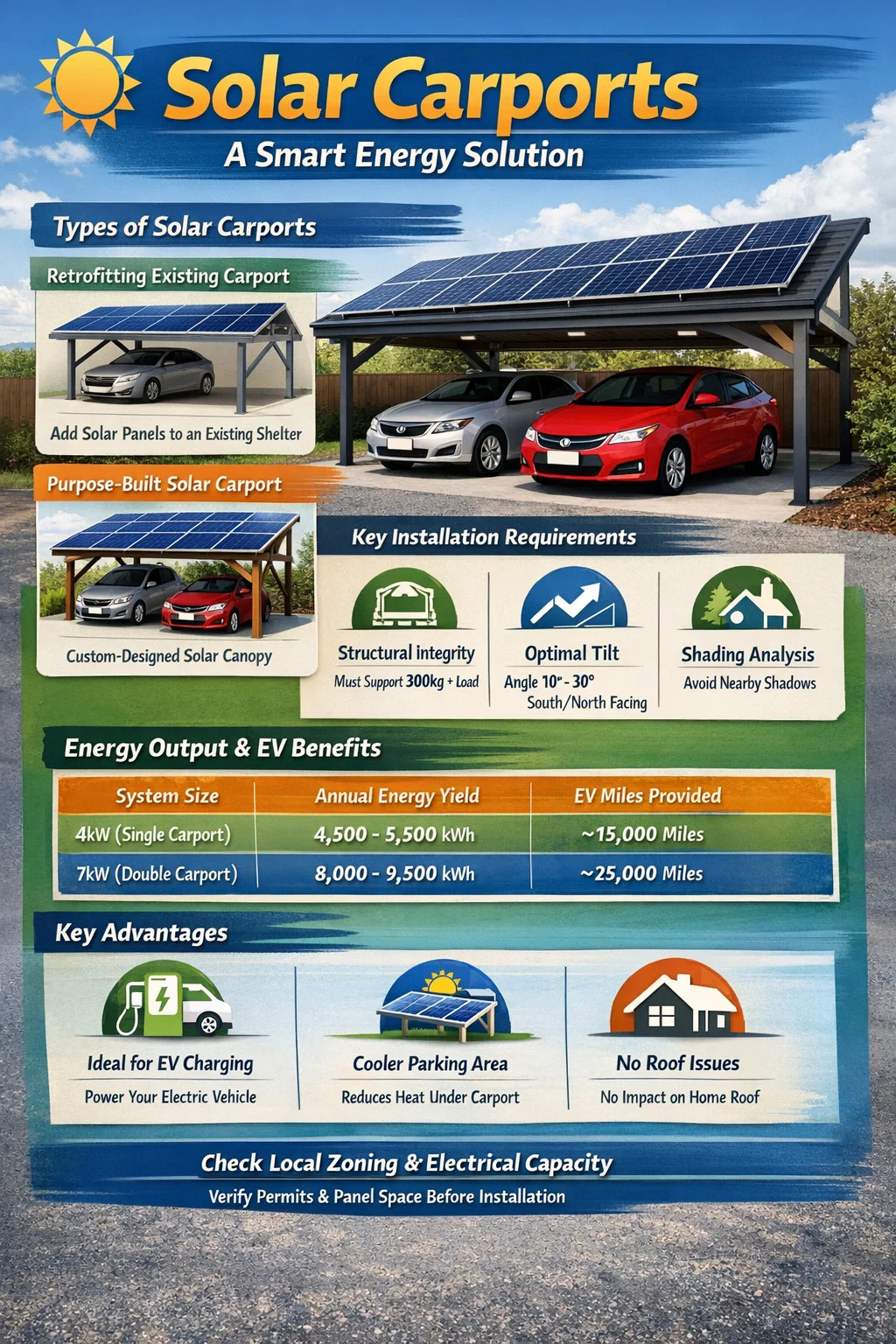 Antes de apostar por una solar cochera proyecto, consulte las leyes de zonificación locales. Debido a que los garajes solares suelen ser más altos que los tradicionales para permitir la inclinación del panel, es posible que requieran distancias específicas de retroceso desde el límite de su propiedad. Además, asegúrese de que su panel eléctrico tenga suficiente espacio para un nuevo disyuntor solar, ya que cochera El sistema funciona igual que un sistema de tejado en términos de conexión a la red.