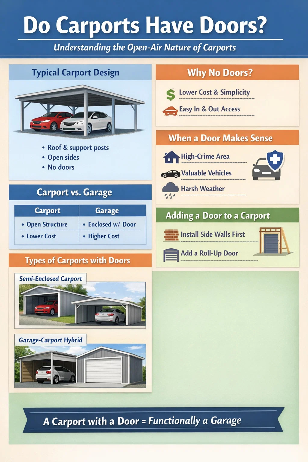 Las cocheras son populares en parte porque son mucho más baratas que los garajes. Un kit básico de marquesina metálica puede costar tan solo $1000–$3500 , mientras que un garaje para un solo automóvil instalado profesionalmente normalmente funciona $20,000–$50,000 o más . Agregar una estructura de puerta, un marco, herrajes e instalación puede agregar entre $1,500 y $5,000 a cualquier proyecto. Para los propietarios que buscan una protección asequible para su vehículo, evitar una puerta mantiene los costos significativamente bajos.