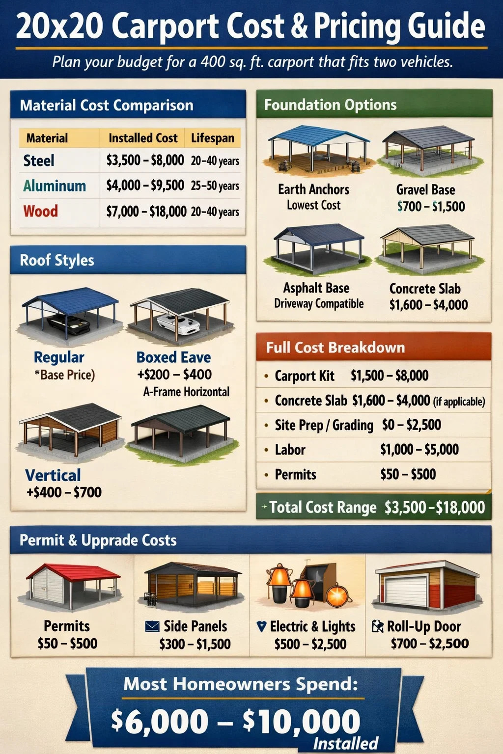 La instalación de una cochera de 20x20 cuesta entre $3,500 y $18,000 en total, y la mayoría de los propietarios gastan entre $6,000 y $10,000. para un garaje para dos autos instalado profesionalmente. La amplia gama refleja diferencias en el tipo de material (madera, acero o aluminio), ya sea que elija un kit prefabricado o una construcción personalizada, tarifas de mano de obra local, necesidades de preparación del sitio y tarifas de permisos. Una cochera en kit de acero básica en un terreno plano en el extremo inferior puede costar menos de $4,000 instalada, mientras que una cochera de madera personalizada con techo de tejas y losa de concreto puede costar mucho más de $15,000. Esta guía desglosa cada factor de costo para que pueda planificar con precisión el presupuesto de su cochera 20x20.