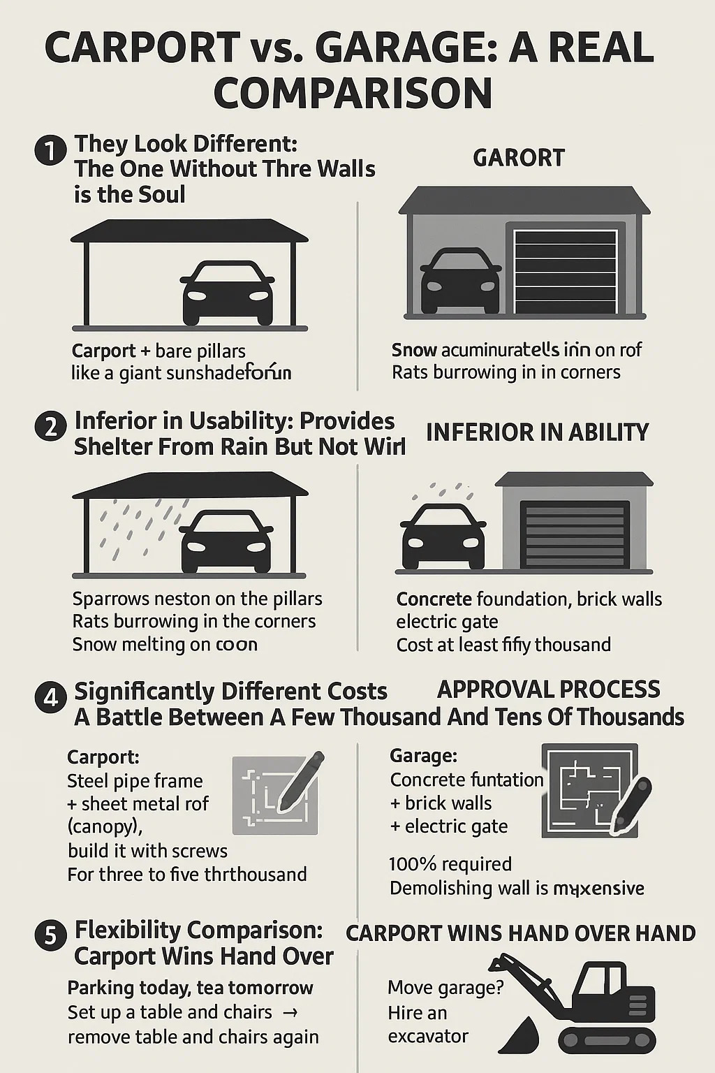 Cochera : → Cubra los pilares desnudos, como una sombrilla gigante para su automóvil; → Abierto al viento, puedes ver el cielo cuando miras hacia arriba después de estacionar.