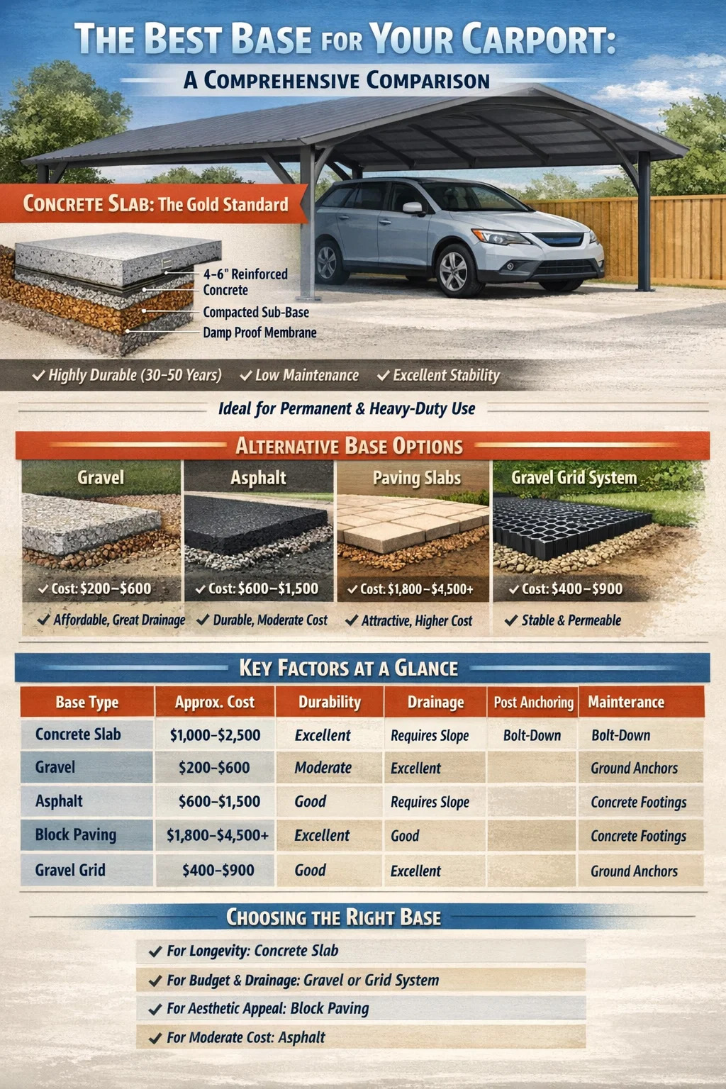 Esta guía desglosa todas las opciones básicas realistas para una cochera, con comparaciones honestas sobre costo, dificultad de instalación, rendimiento del drenaje y durabilidad a largo plazo. Ya sea que esté construyendo una cochera metálica independiente, una estructura con estructura de madera o un cobertizo adjunto a su garaje, la base que elija afectará directamente el rendimiento de todo el proyecto con el tiempo.
